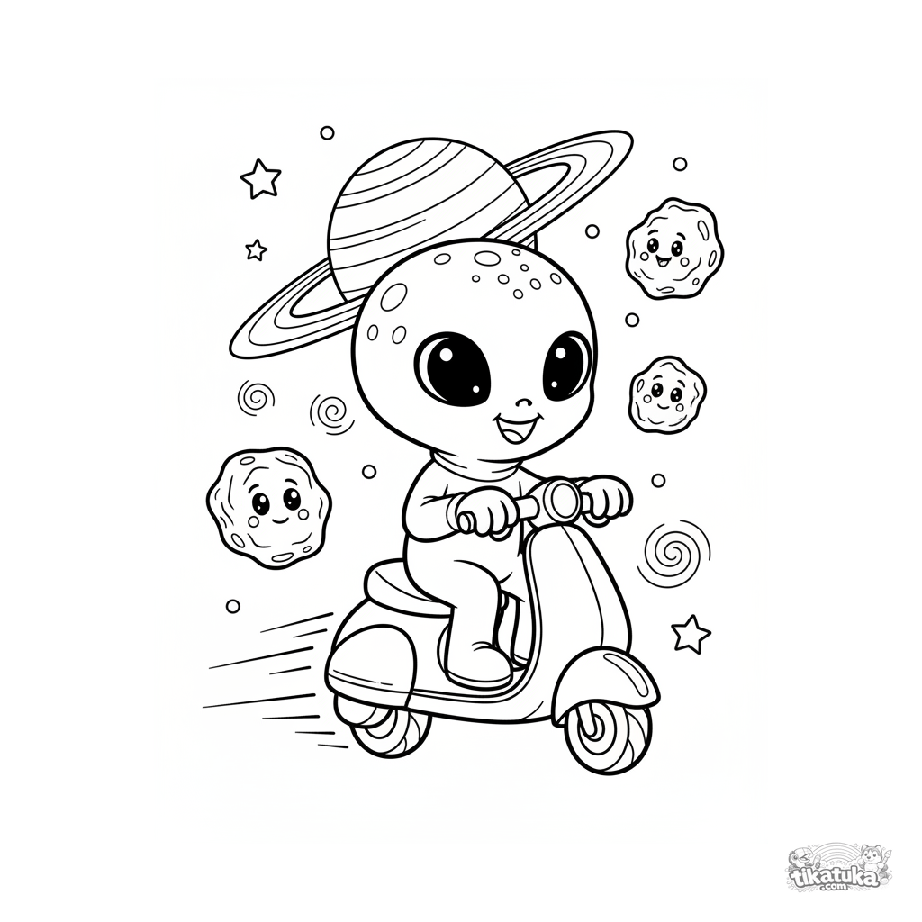 Página para colorir de um explorador alienígena amigável em um scooter flutuante passando por um planeta com anéis e asteroides engraçados. Para crianças de 4 a 6 anos.