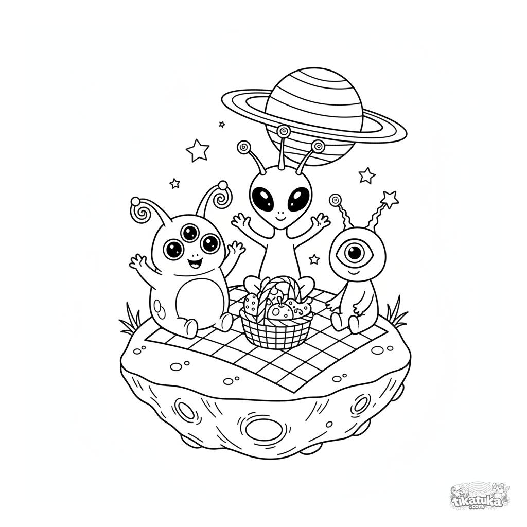 Página para colorir para crianças: uma família alienígena amigável faz um piquenique em um asteroide flutuante no espaço. Cena divertida com detalhe moderado para 4-6 anos.