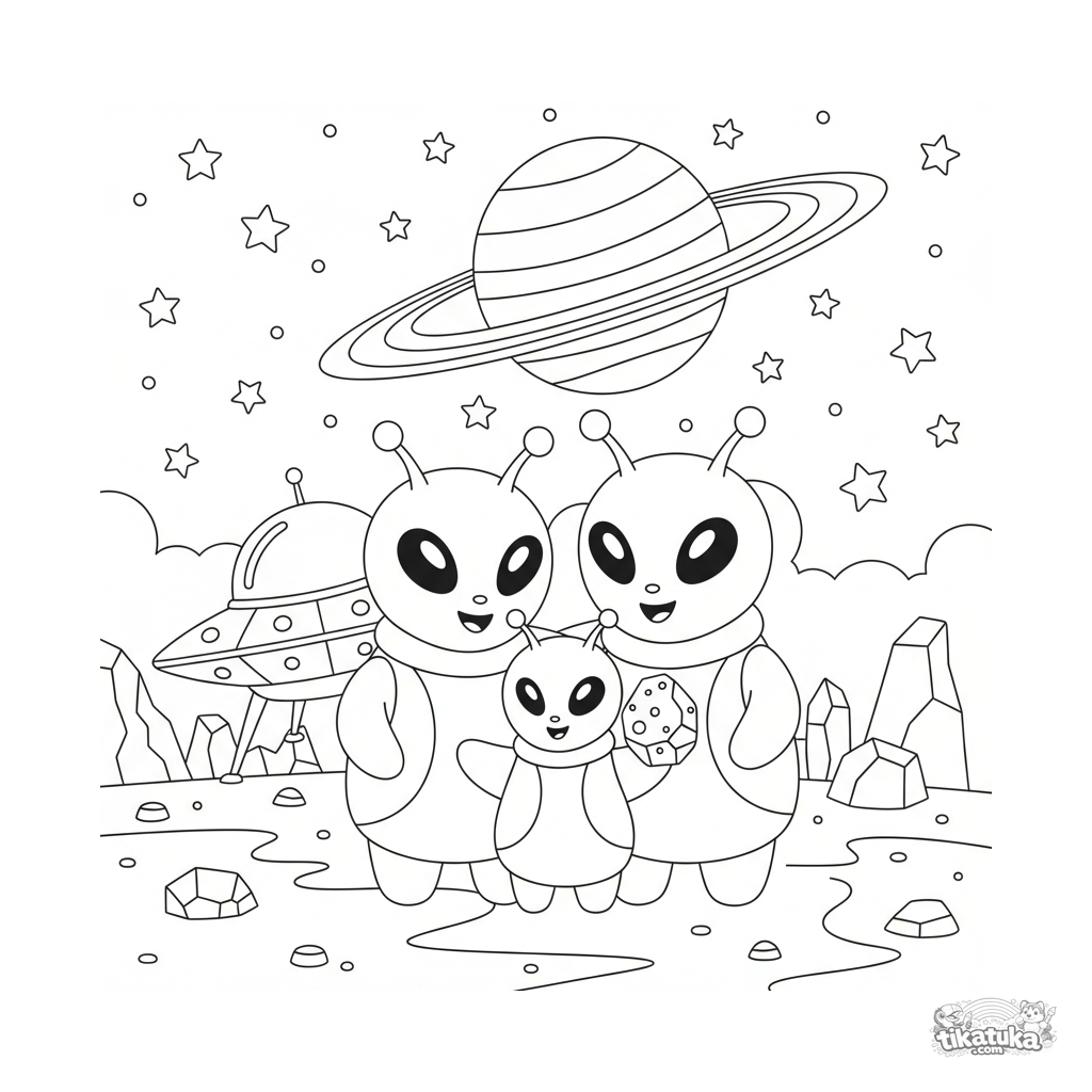 Página para colorir de uma família alienígena amigável ao lado de seu disco voador com um planeta anelado ao fundo. Para crianças 4-6 anos.