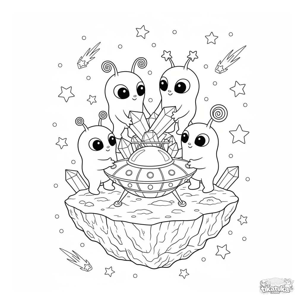 Página para colorir espacial difícil para crianças 7-12: uma família de alienígenas amigáveis descarrega seu disco voador em um asteroide. Múltiplos detalhes e elementos.