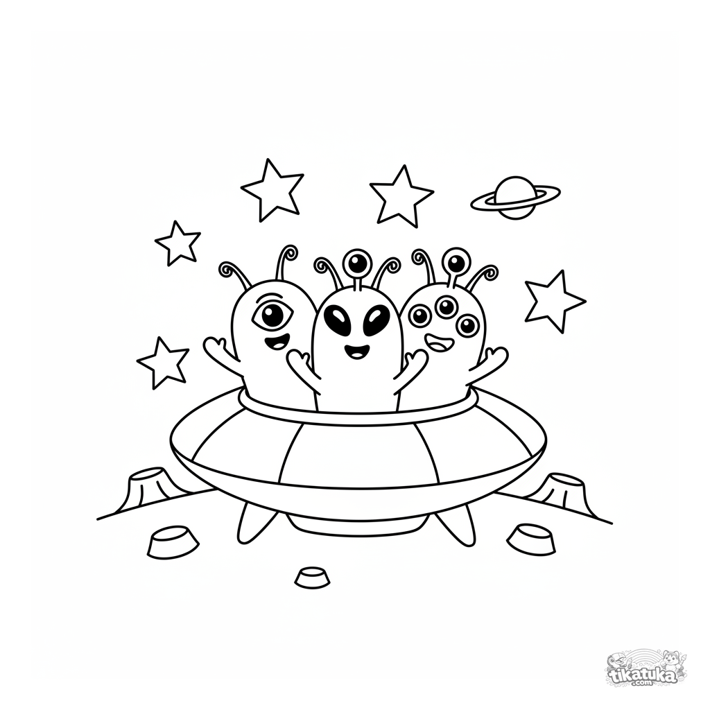 Página simples para colorir para crianças pequenas de 2-3 anos: uma família alienígena amigável acena de sua nave espacial oval. Formas grandes, poucos detalhes.