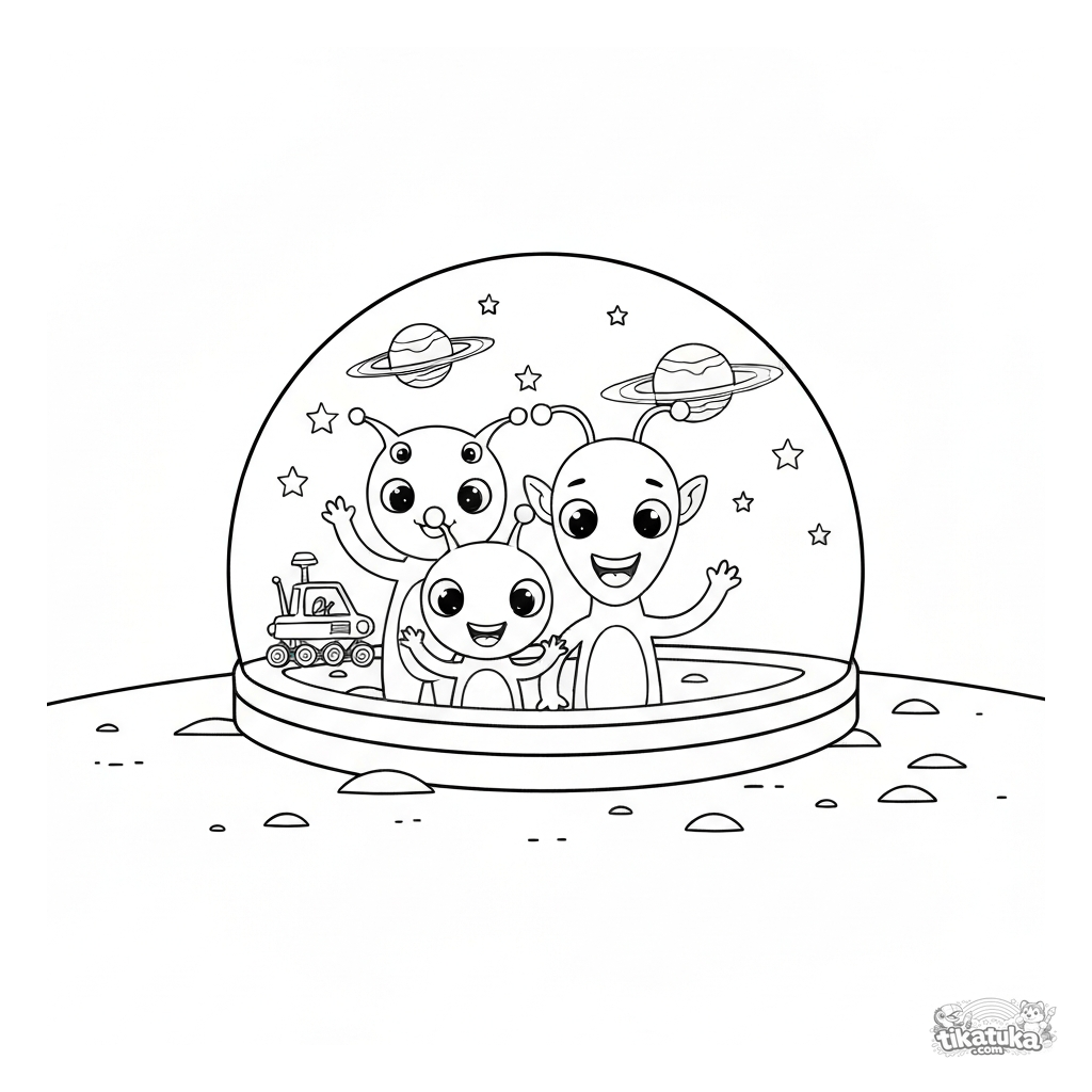 Página para colorir de uma família alienígena acenando de sua cúpula em Marte. Para crianças de 6 a 9 anos. Cena espacial.