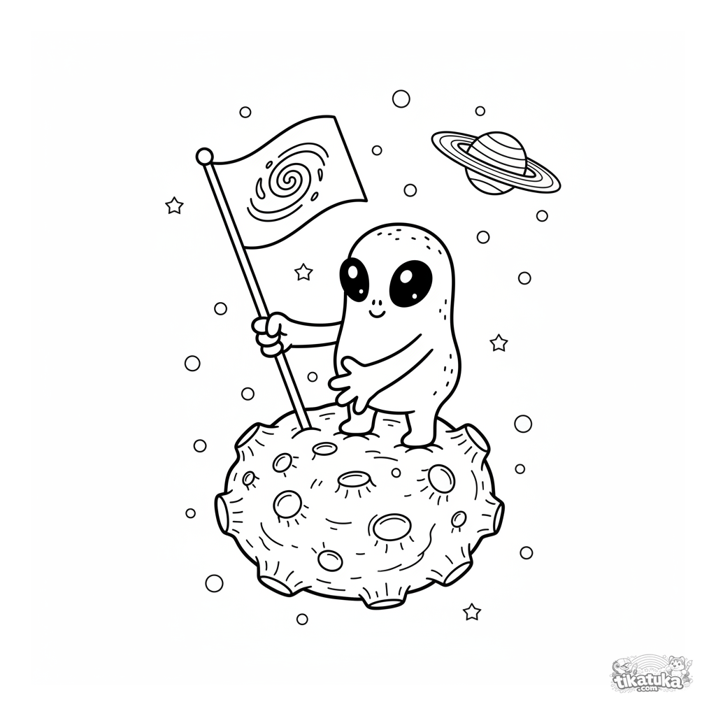 Página espacial para colorir para crianças de 4-6 anos: um alienígena amigável planta uma bandeira num pequeno asteroide. Formas simples e uma história divertida são ótimas para uma primeira introdução ao espaço.