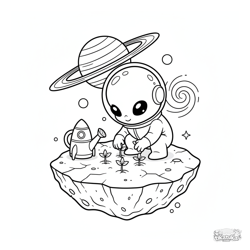 Página para colorir para crianças de 4-6 anos: um alienígena fofo plantando pequenas mudas de estrelas na superfície de um asteroide. Cena espacial divertida para estimular a imaginação.