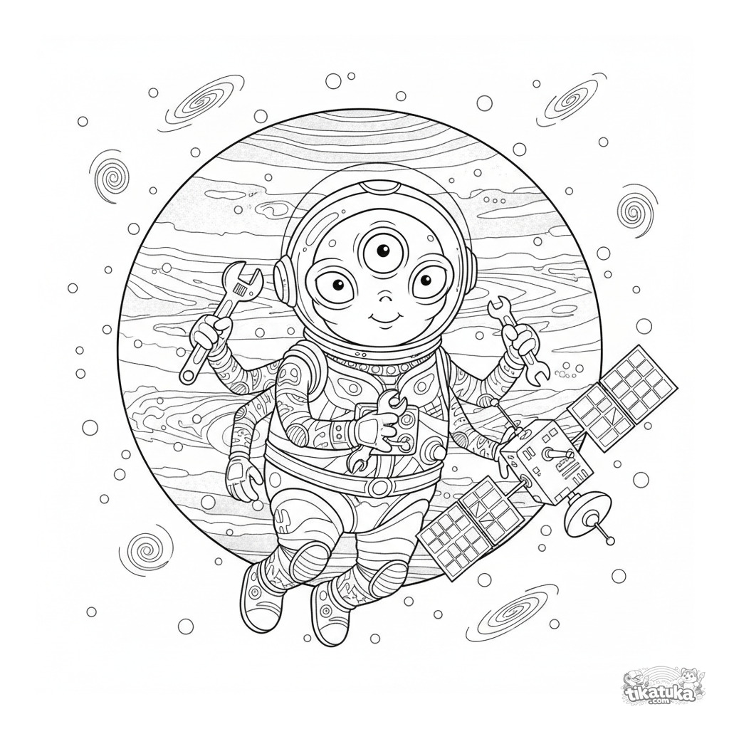 Página para colorir difícil para crianças de 7-12 anos: um alienígena amigável consertando um satélite em órbita ao redor de Júpiter. Uma cena espacial detalhada.