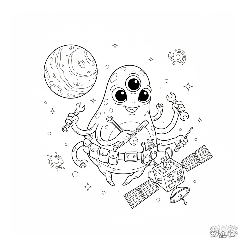 Página para colorir espacial realista e detalhada para crianças maiores de 7-12 anos: um alienígena com tentáculos conserta um satélite. Cena complexa com planetas ao fundo.
