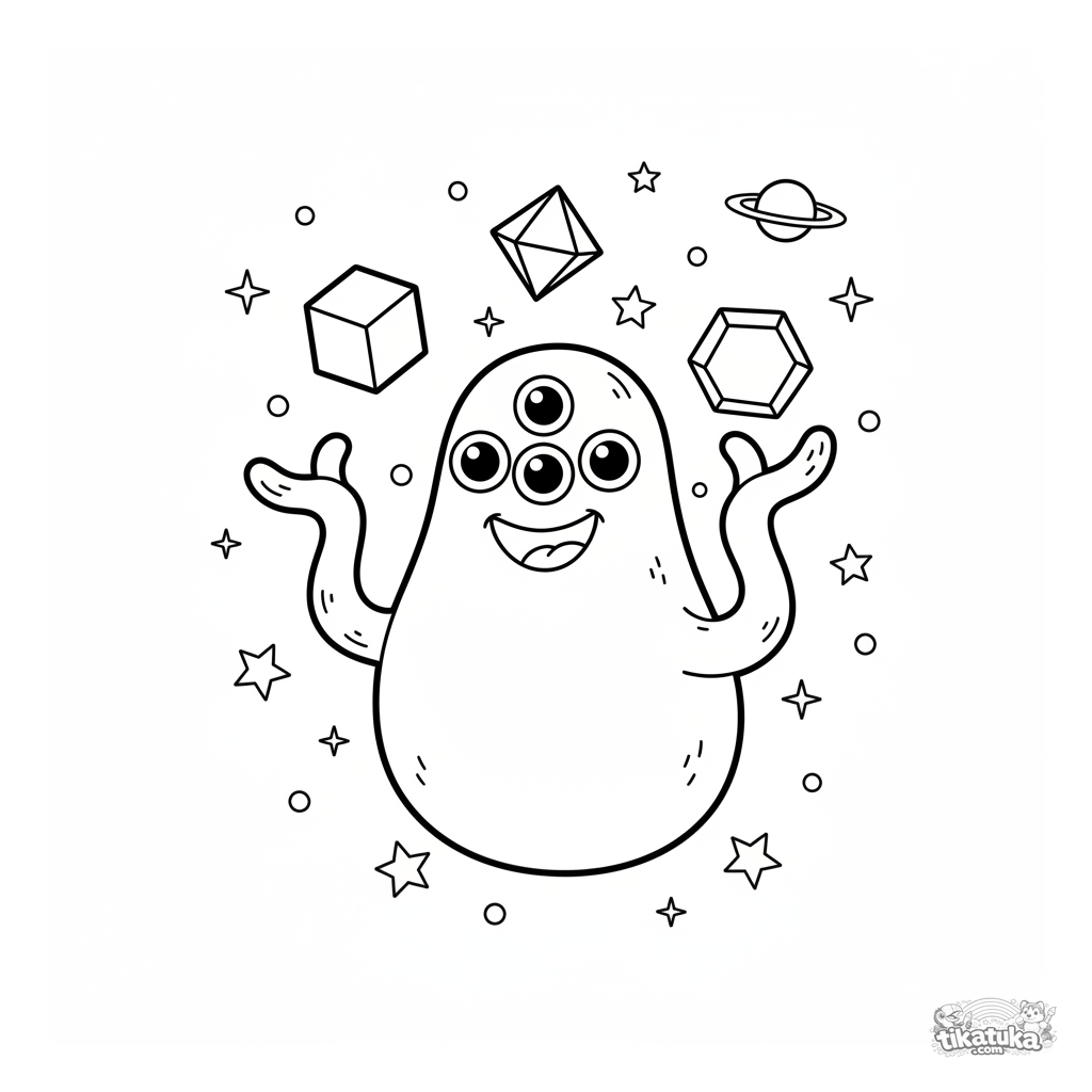 Página para colorir para crianças de 4-6 anos: um alienígena amigável de três olhos faz malabarismo com cristais flutuantes no espaço. Cena espacial divertida e simples.