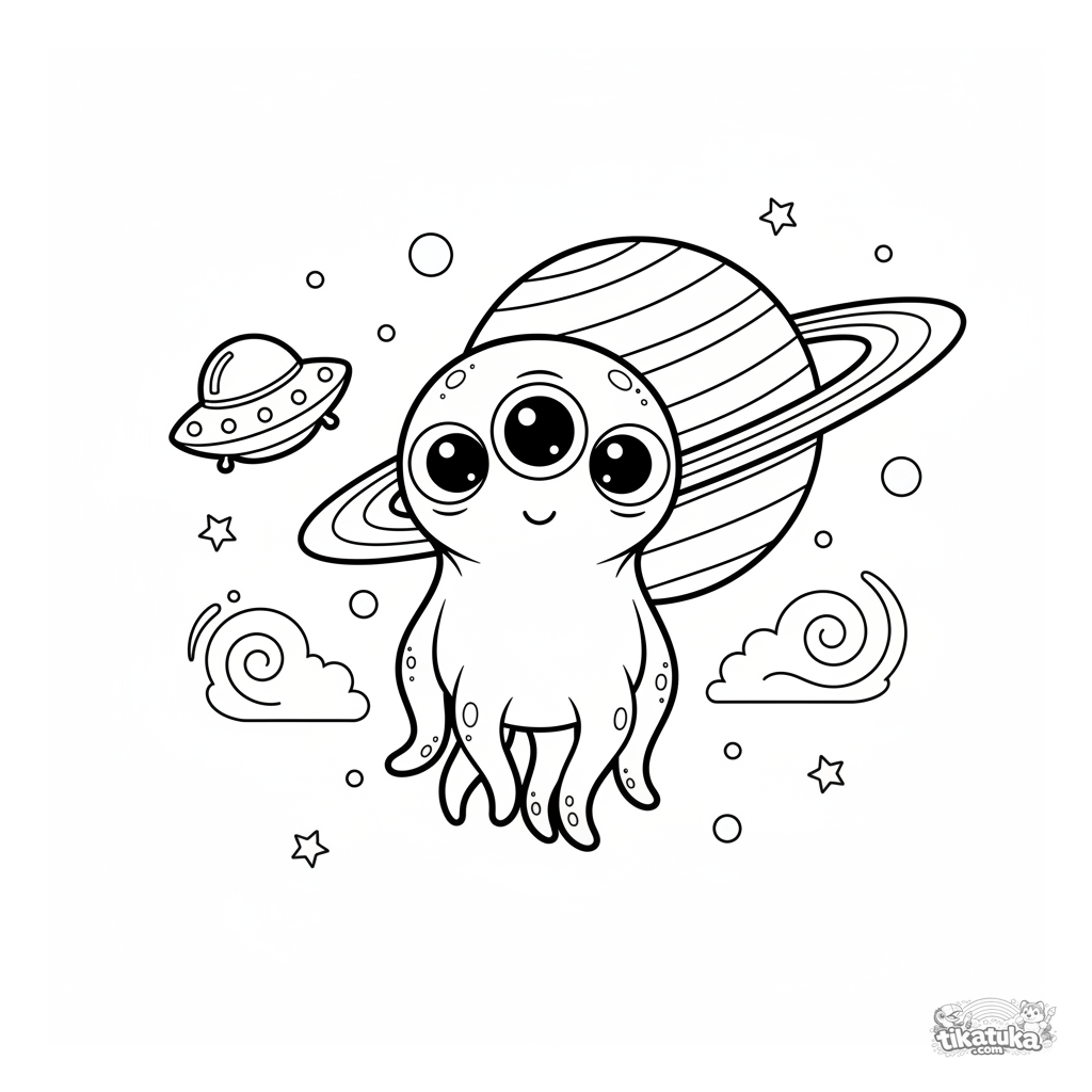 Página para colorir de um alienígena amigável flutuando no espaço perto de um planeta anelado e de um pequeno disco voador. Para crianças de 4 a 6 anos.