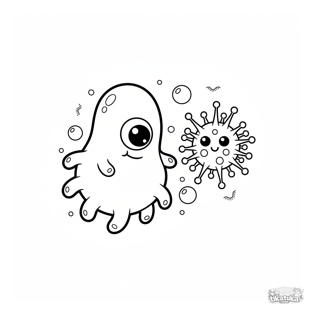 Página para colorir para crianças: uma ameba microbiana amigável flutuando perto de um vírus de desenho animado. Para 4-6 anos.