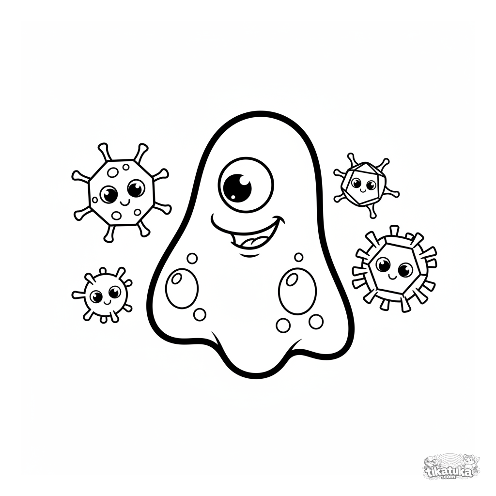 Uma página para colorir de Micróbios com nível Fácil. Ela combina com a idade 4-6 anos, imprime bem em casa e abre imediatamente no modo online.
