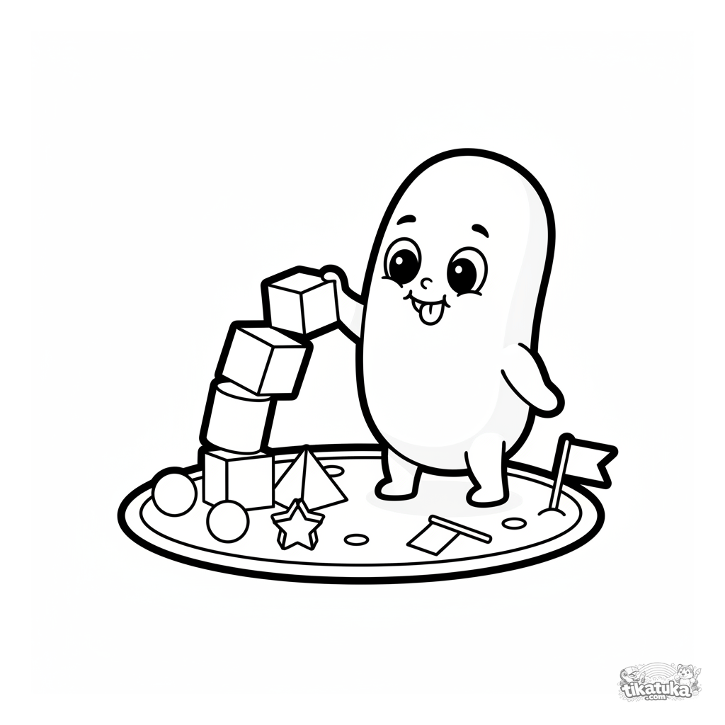 Página para colorir fácil para crianças de 2-5 anos: um bacilo amigável em forma de bastão constrói uma torre com blocos.