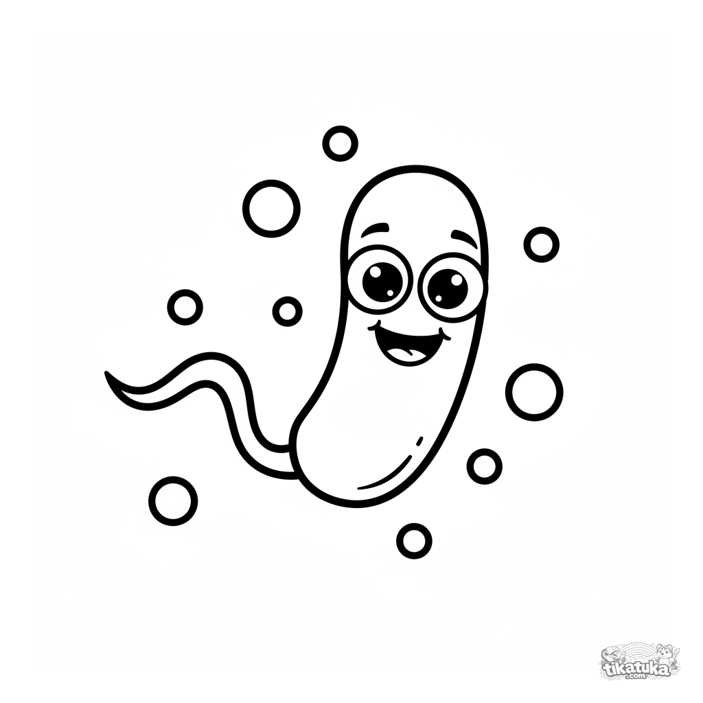 Página para colorir simples para crianças pequenas 2-3: uma bactéria de desenho animado amigável com olhos grandes nada usando um flagelo. Formas grandes e simples, pontos de nutrientes flutuando.