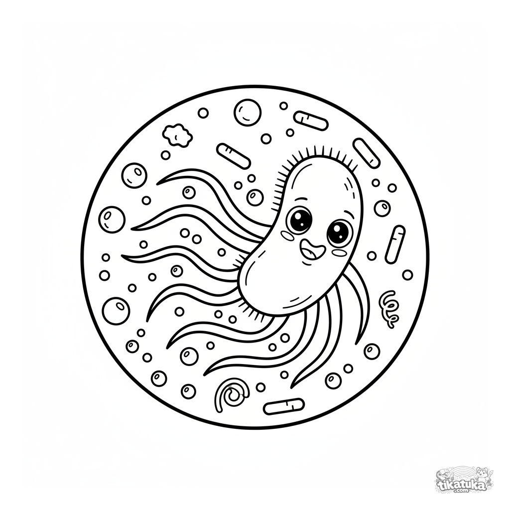 Uma página para colorir de Micróbios com nível Médio. Ela combina com a idade 3-6 anos, imprime bem em casa e abre imediatamente no modo online.