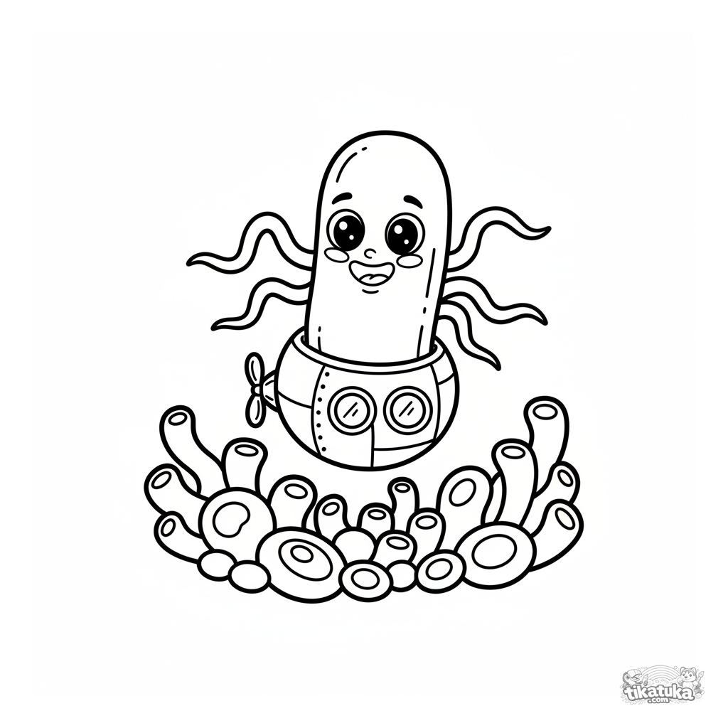 Página simples para colorir para crianças de 2-3 anos com uma bactéria amigável num submarino. Formas grandes, detalhes mínimos, margens amplas.