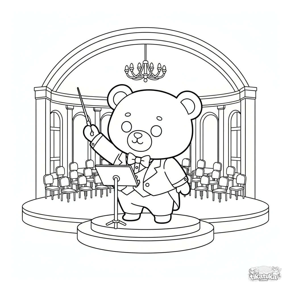 Página para colorir para crianças de 4 a 6 anos: um urso de pelúcia de fraque conduz uma orquestra no grande palco de uma sala de concertos.