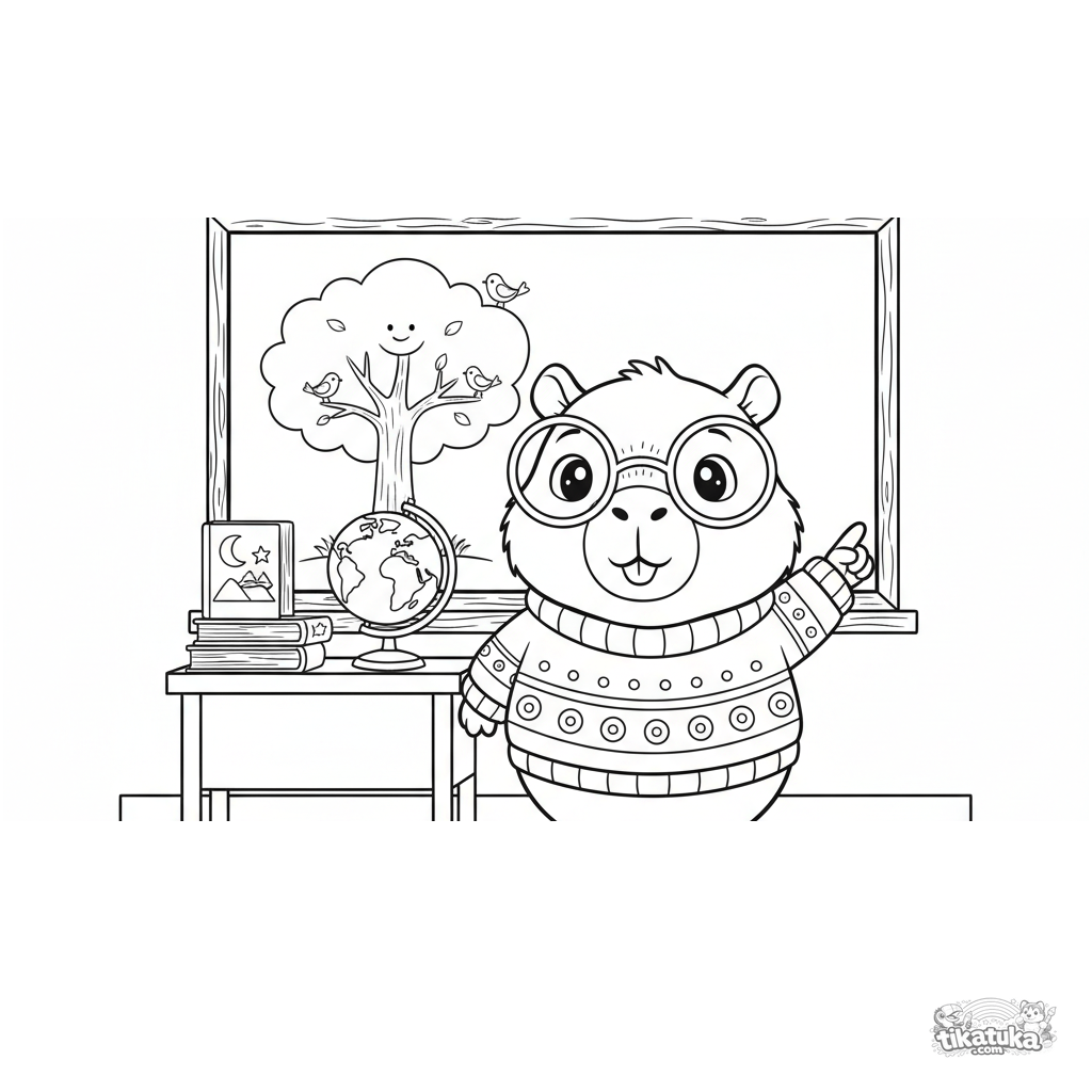 Página para colorir para crianças 4-6: um professor capivara amigável na sala de aula. Ensinando, apontando para um desenho de giz, com livros e um globo por perto.