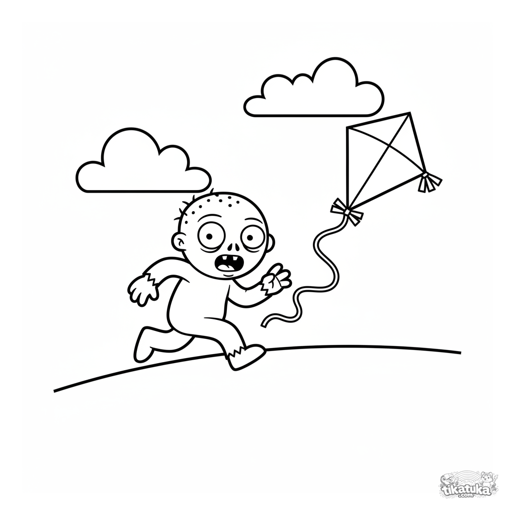 Página simples para colorir para crianças de 2-3 anos com um zumbi amigável. O zumbi corre em uma colina tentando soltar uma pipa, com a linha embaraçada. Formas grandes, poucos detalhes.
