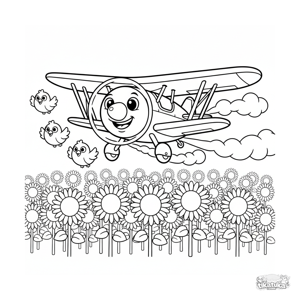 Página simples para colorir de um avião pulverizador para crianças pequenas de 2-3 anos. O avião tem um sorriso no nariz, voando baixo sobre girassóis. Formas grandes, contornos grossos, muito espaço.