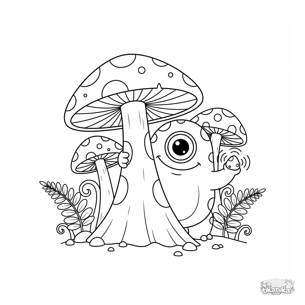 Página para colorir para crianças 4-6: um ciclope monstro amigável espiando atrás de um toco de cogumelo gigante na floresta. Formas simples e cena fofa.