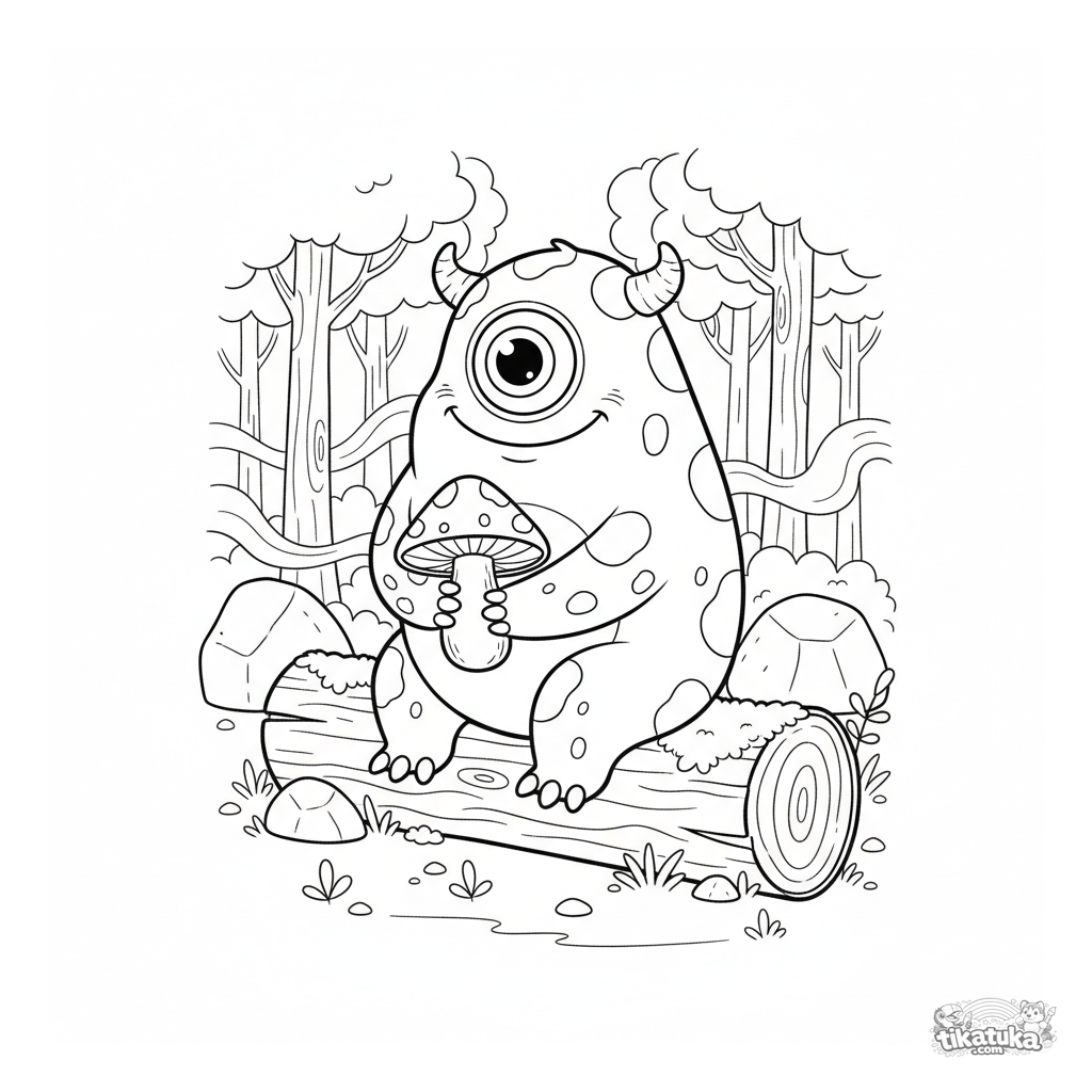 Página para colorir de um monstro ciclope amigável com pele manchada em uma floresta. Para crianças de 4 a 6 anos. O monstro senta em um tronco segurando um cogumelo brilhante.