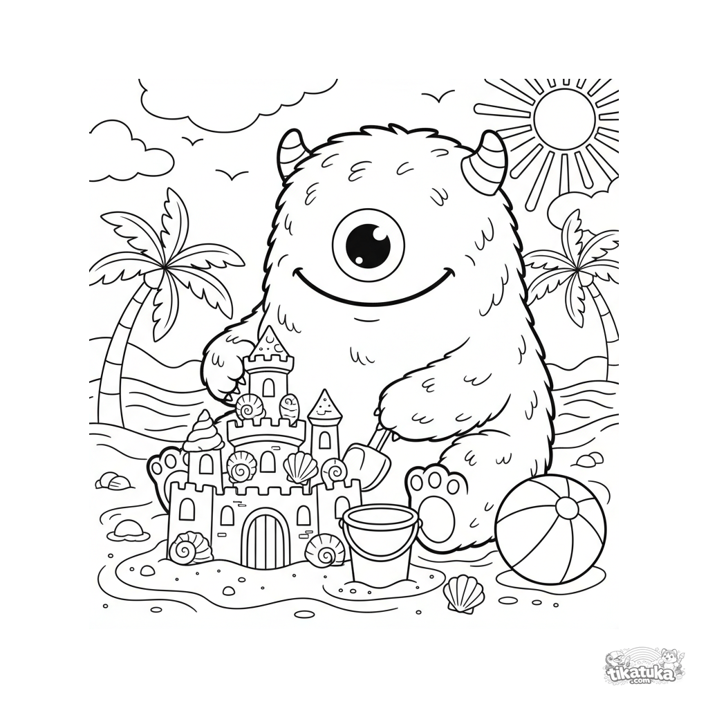 Página para colorir de um monstro peludo e amigável construindo um castelo de areia na praia. Para crianças de 5 a 8 anos. Cena divertida e fofa com balde e conchas.