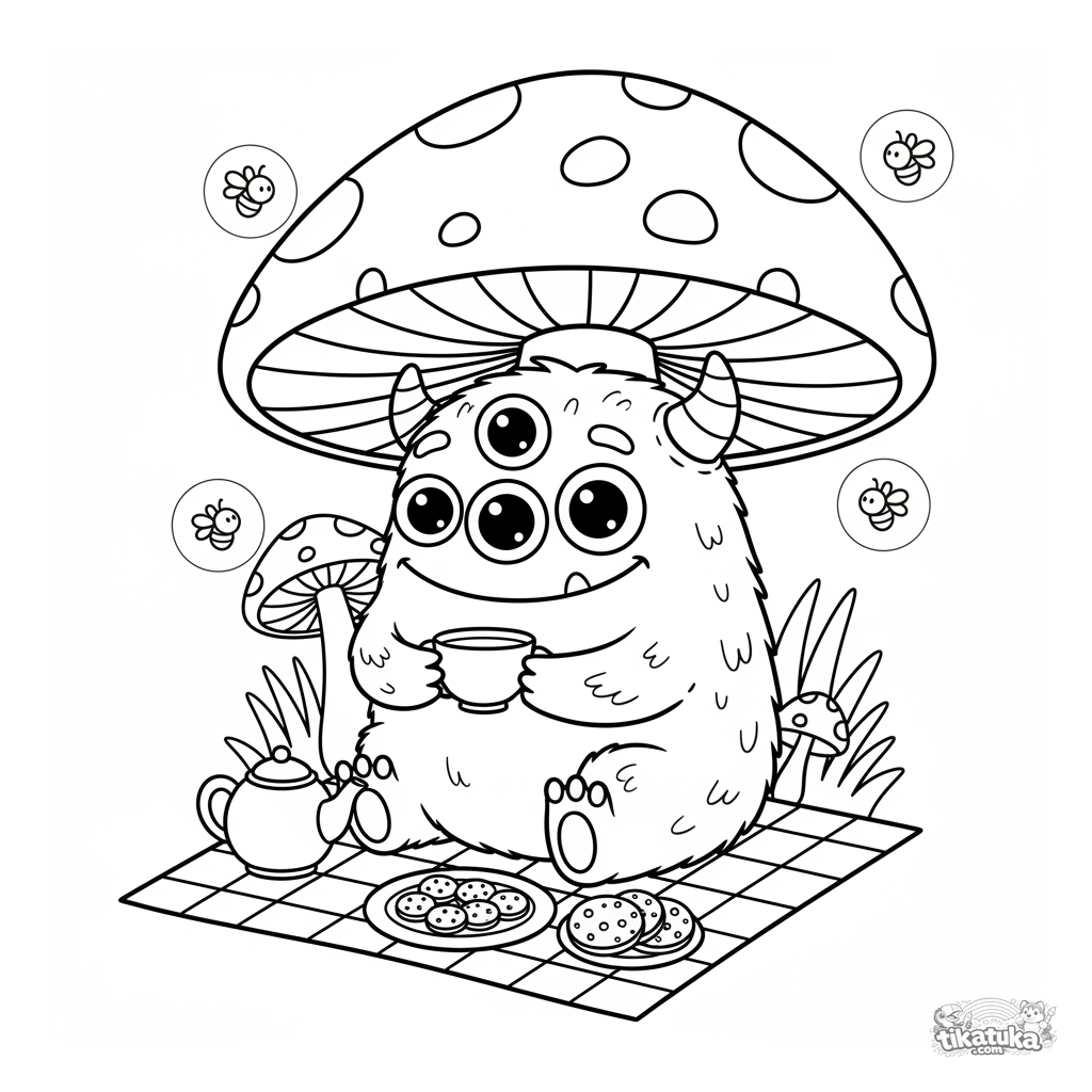 Página para colorir de um monstro peludo de três olhos amigável fazendo um piquenique de chá sob um cogumelo gigante. Para crianças de 5 a 8 anos.