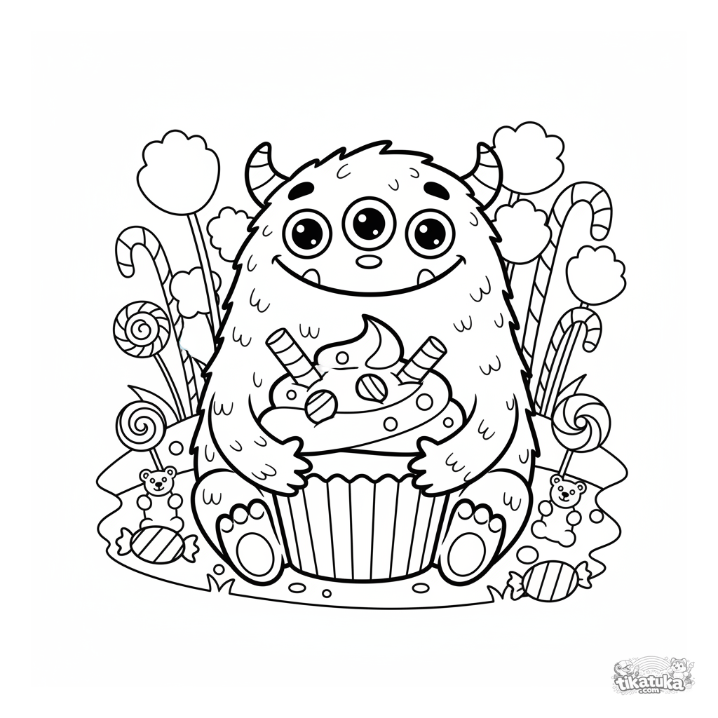Página para colorir para crianças: um monstro peludo abraça um cupcake gigante. Cena engraçada em um campo de doces, para 4-6 anos.