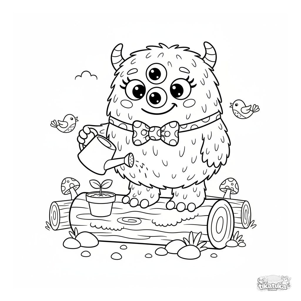 Página para colorir para crianças de 4-6 anos: um monstro felpudo amigável com três olhos rega um pequeno broto em um vaso.