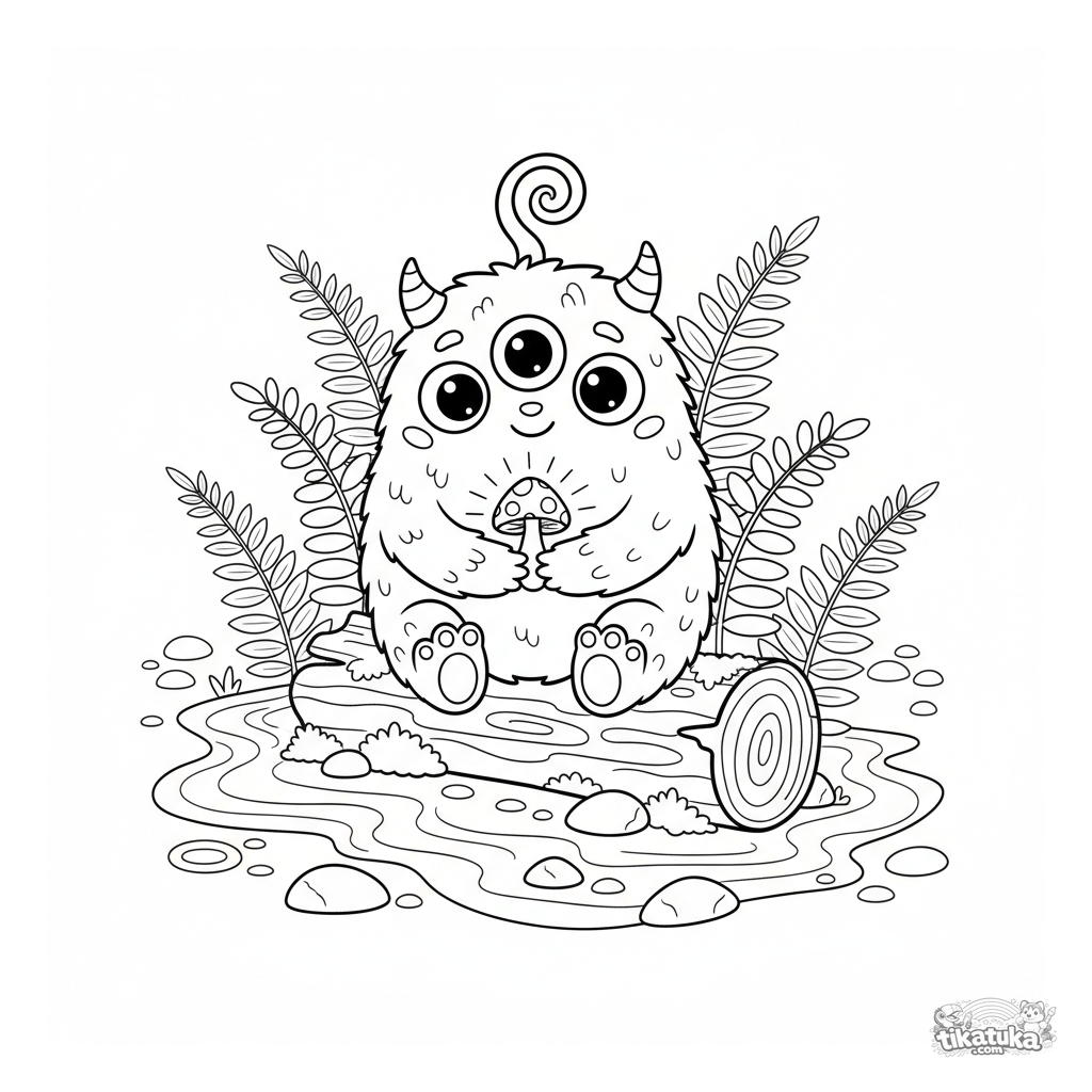 Página para colorir de um monstro peludo e amigável de três olhos em uma floresta. Para crianças de 4 a 6 anos.