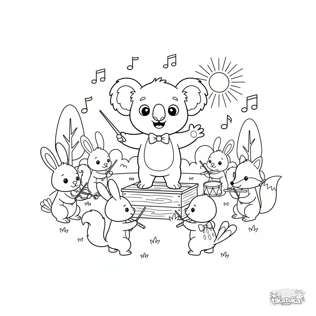 Página para colorir para crianças 4-6: um coala maestro conduz uma orquestra de animais em um festival. Cena alegre com notas musicais flutuantes.