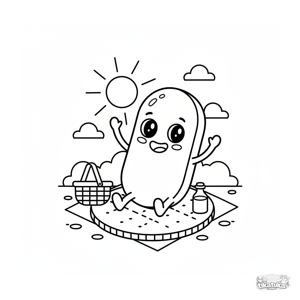 Página para colorir fácil para crianças pequenas de 2-4 anos. Um micróbio de desenho animado amigável faz um piquenique em uma bolacha grande.
