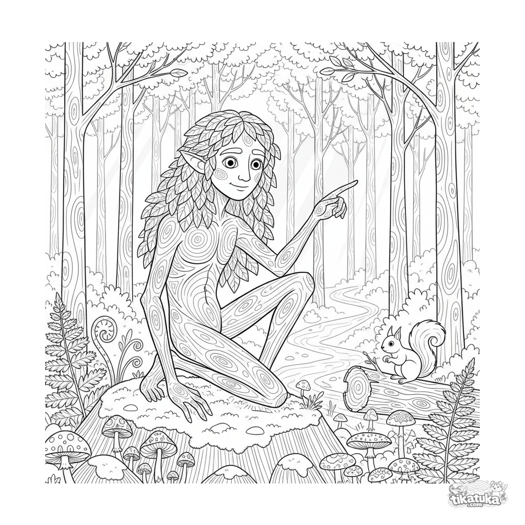 Página para colorir para 7+ anos: um Leshy amigável, um espírito da floresta eslavo, aponta o caminho em uma trilha na floresta. Cena detalhada com cogumelos e samambaias.