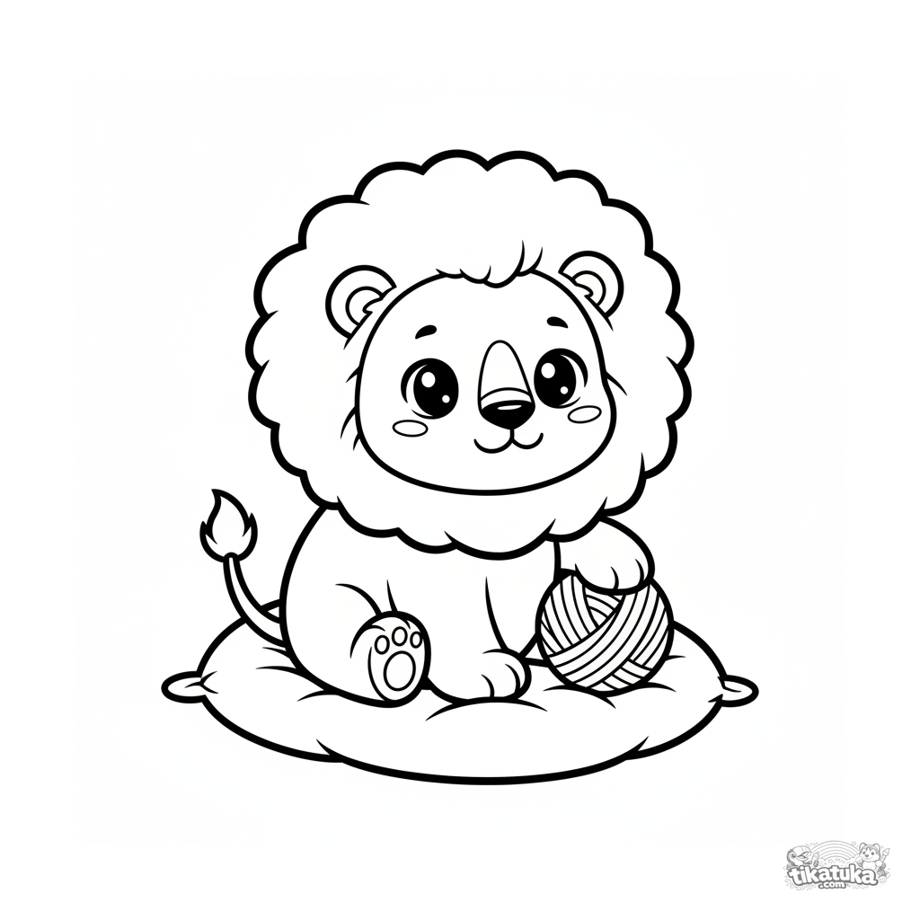 Página para colorir para bebês: um leão de pelúcia gentil com juba fofa senta-se em um travesseiro. Grandes áreas fechadas de juba e corpo são fáceis de colorir para crianças de 2-3 anos.