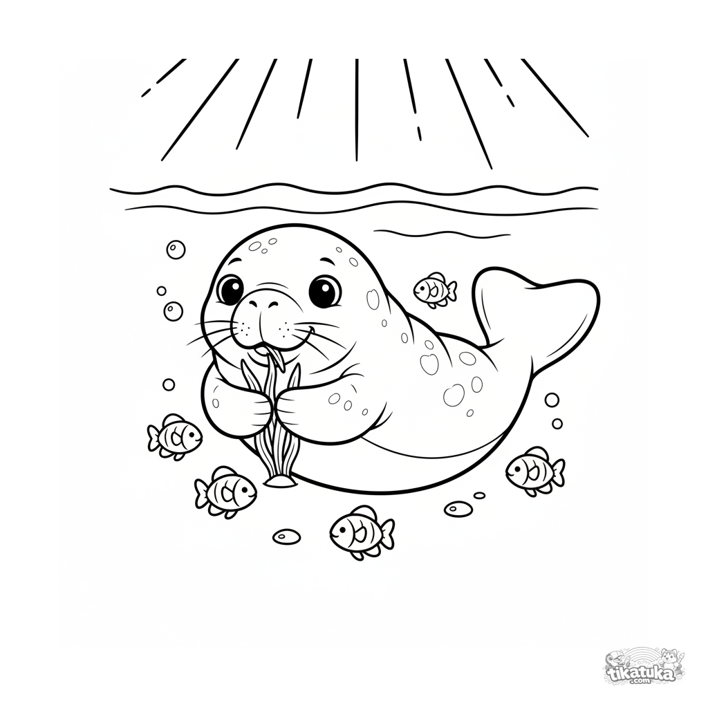Página para colorir para crianças de 4-6 anos: Um peixe-boi amigável pasta ervas marinhas em águas rasas ensolaradas. Estilo de mascote de pelúcia.