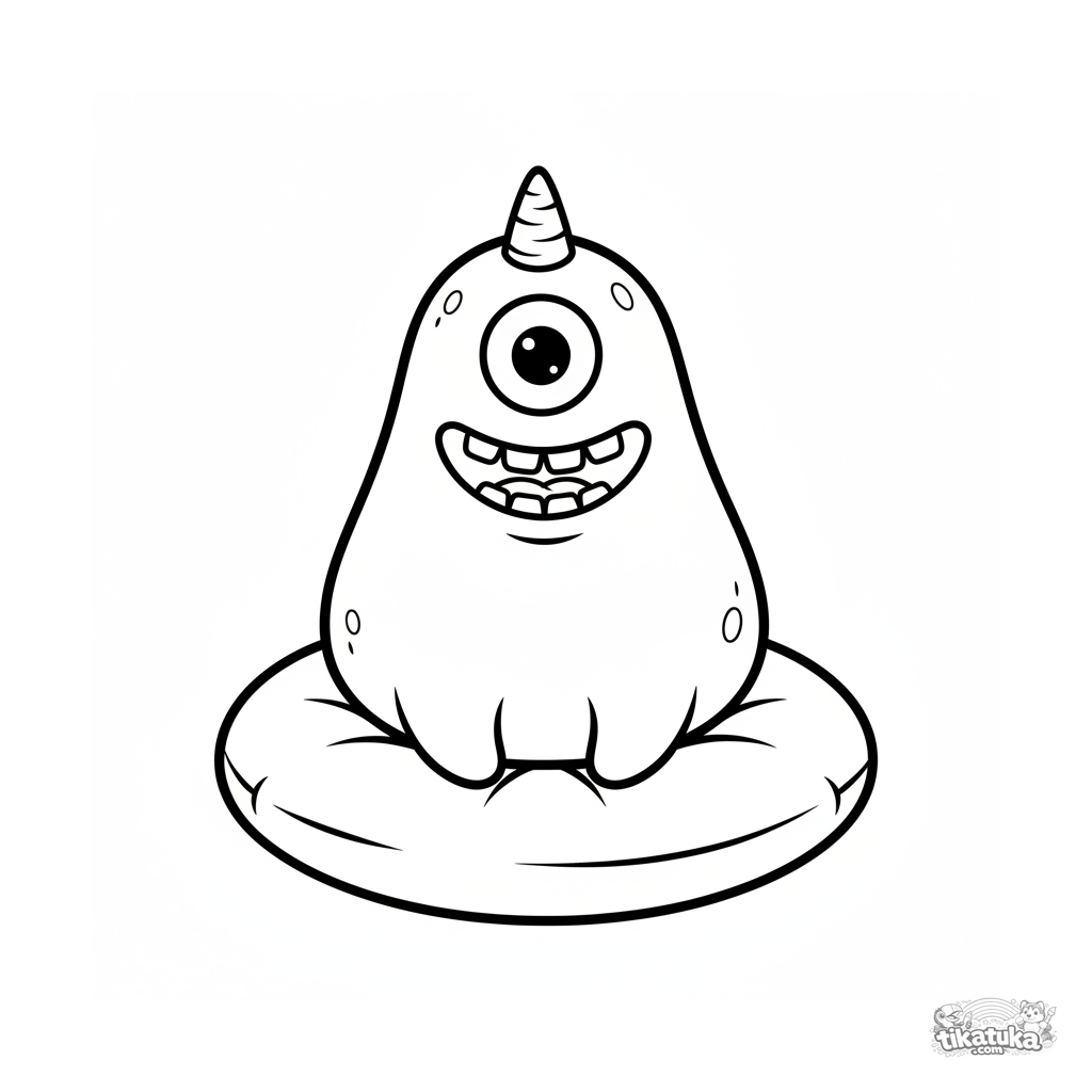 Página divertida para colorir para 2-3 anos: um monstro gota amigável senta-se em uma almofada. Formas grandes e simples.