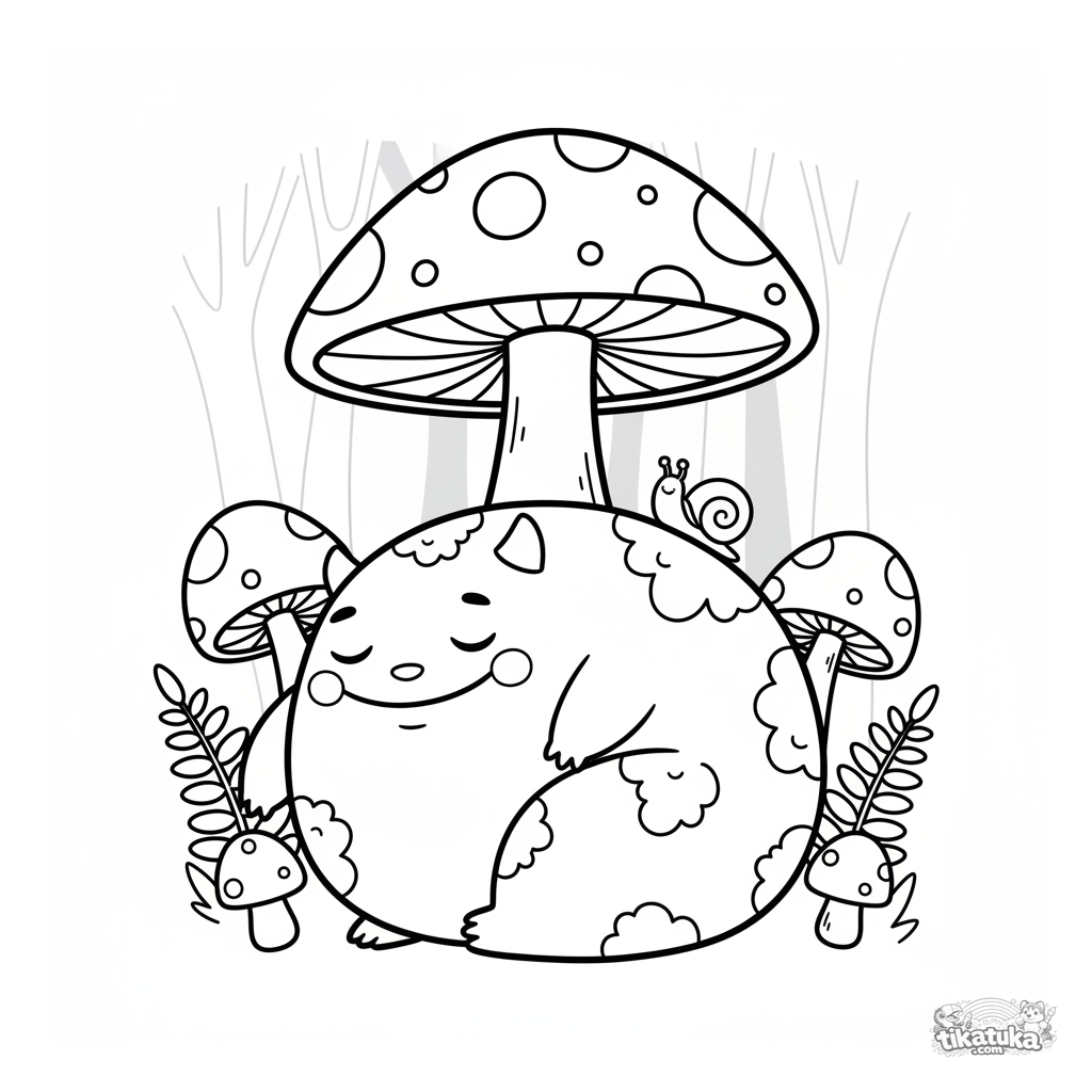 Página para colorir simples para crianças pequenas: um monstro de musgo amigável cochilando sob um cogumelo gigante. Para 2-3 anos, formas grandes e simples.