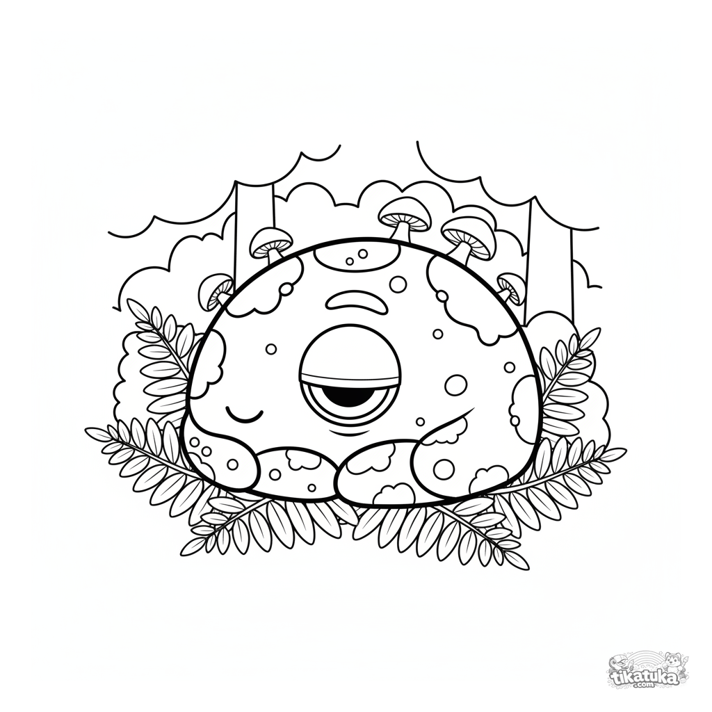 Página para colorir para crianças pequenas: um monstro de pedra musgoso e amigável dormindo em um bosque de samambaias. Formas grandes e simples com margens amplas.