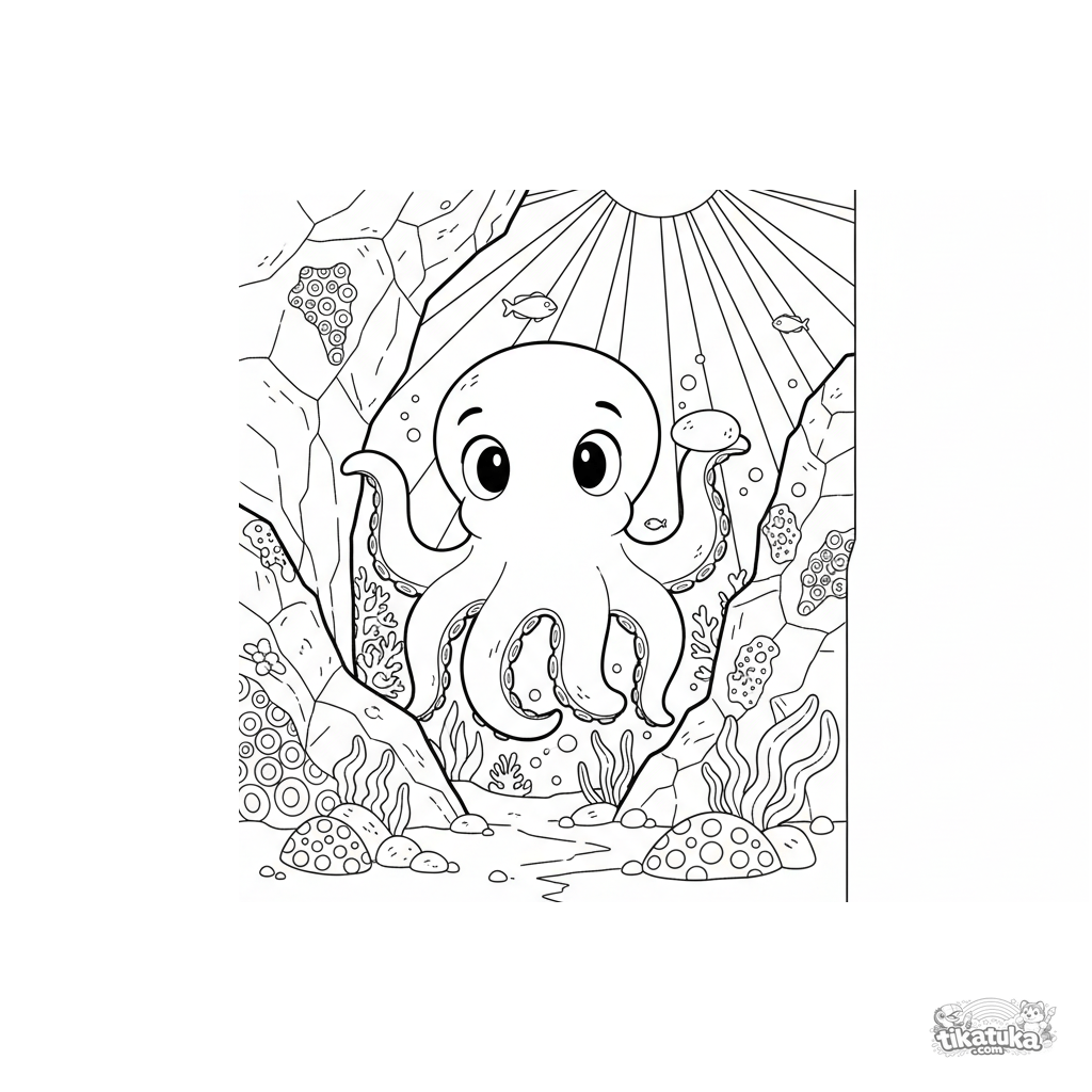 Página para colorir de um polvo brincando de esconde-esconde entre rochas em águas rasas ensolaradas. Para crianças de 4 a 6 anos.