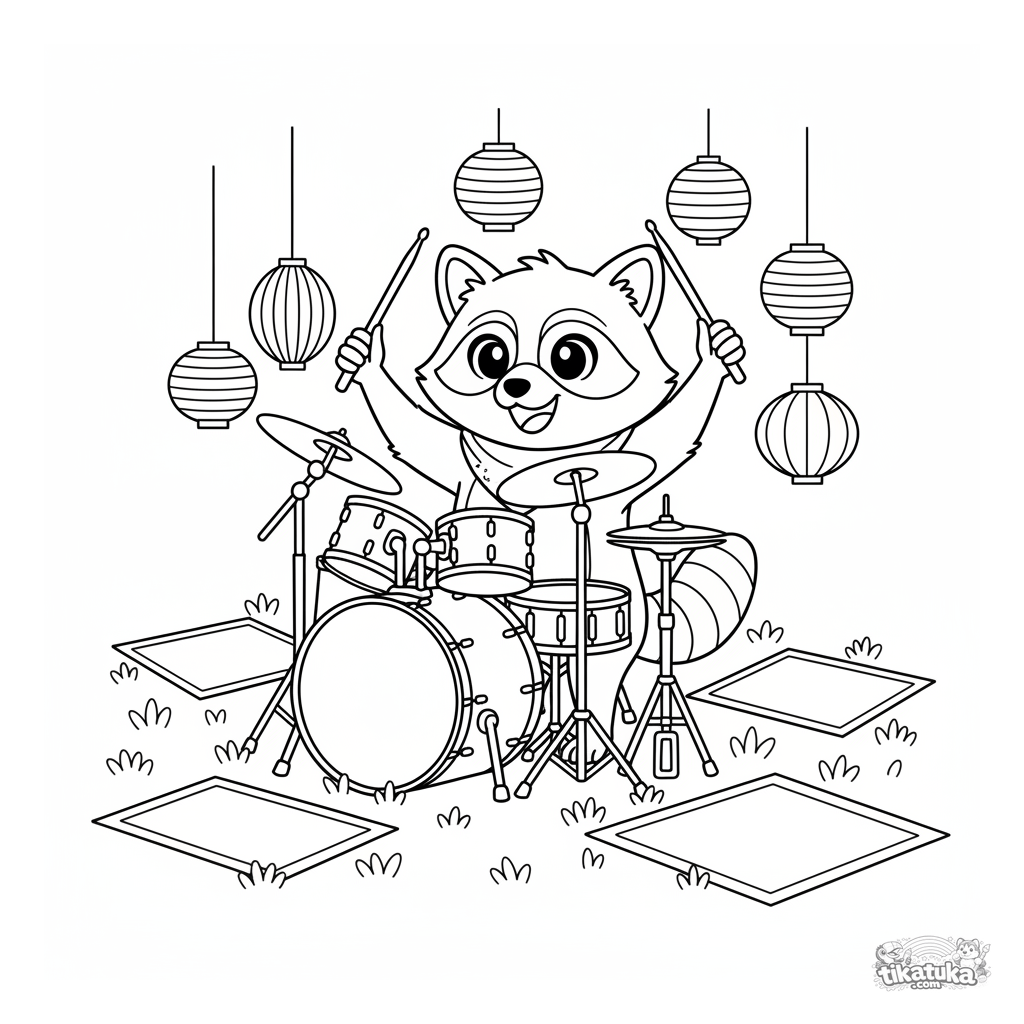 Página para colorir para crianças de 4-6 anos: um alegre guaxinim baterista toca bateria na grama de um festival. Formas simples e personagem amigável.