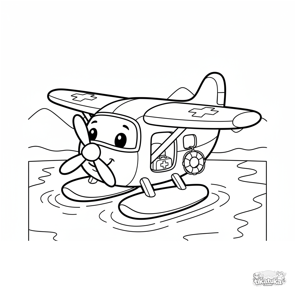 Página simples para colorir de um hidroavião para bebês de 2-3 anos. Uma aeronave amigável com janelas sorridentes flutua em um lago calmo.