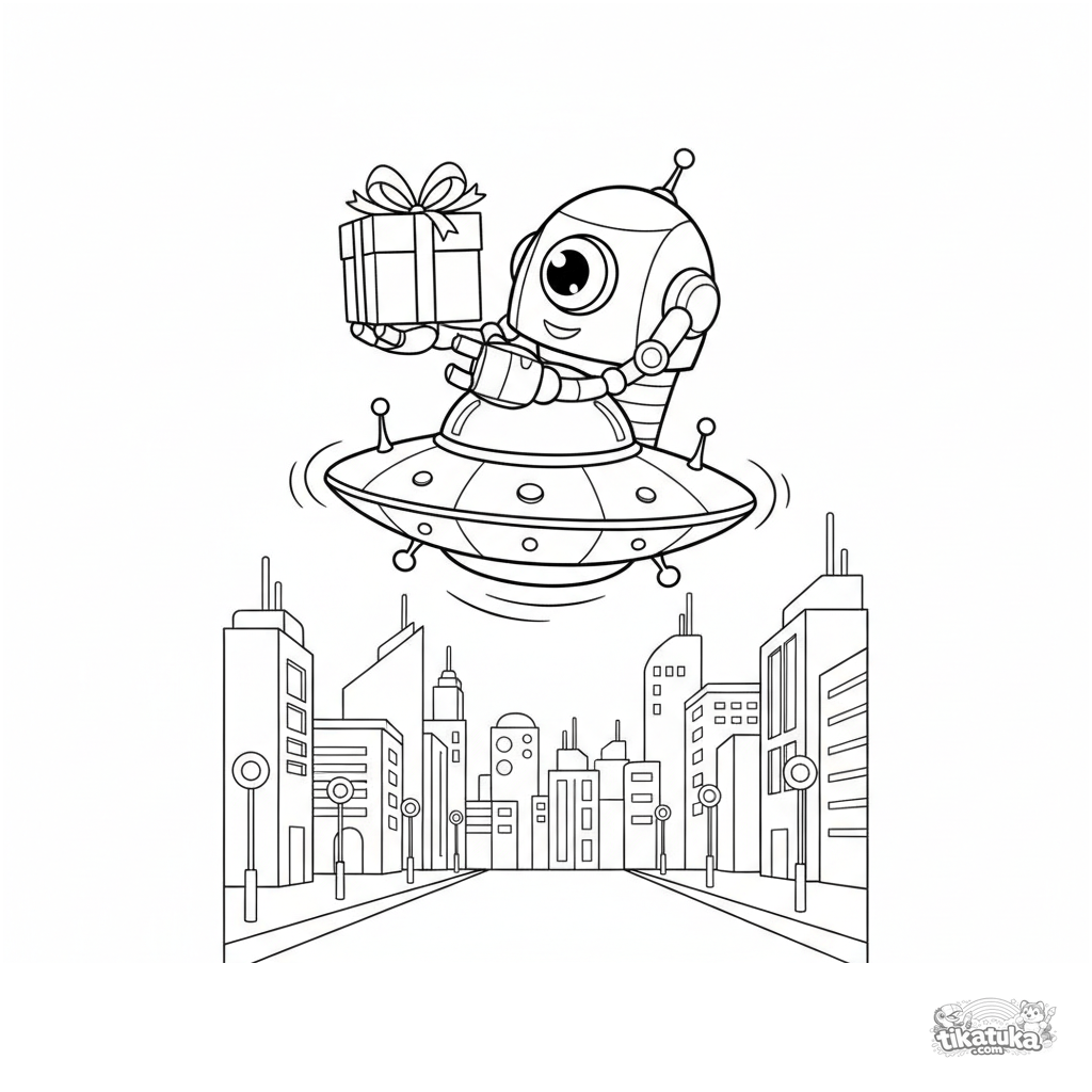 Página para colorir para meninos de 4-6 anos: um robô de entrega amigável em um disco voador carrega um pacote sobre uma cidade futurista. Formas claras, cena simples.