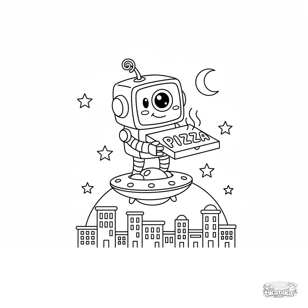 Página para colorir para meninos de 4-6 anos: um robô entregador amigável se equilibra em um disco voador carregando uma pizza sobre a cidade.