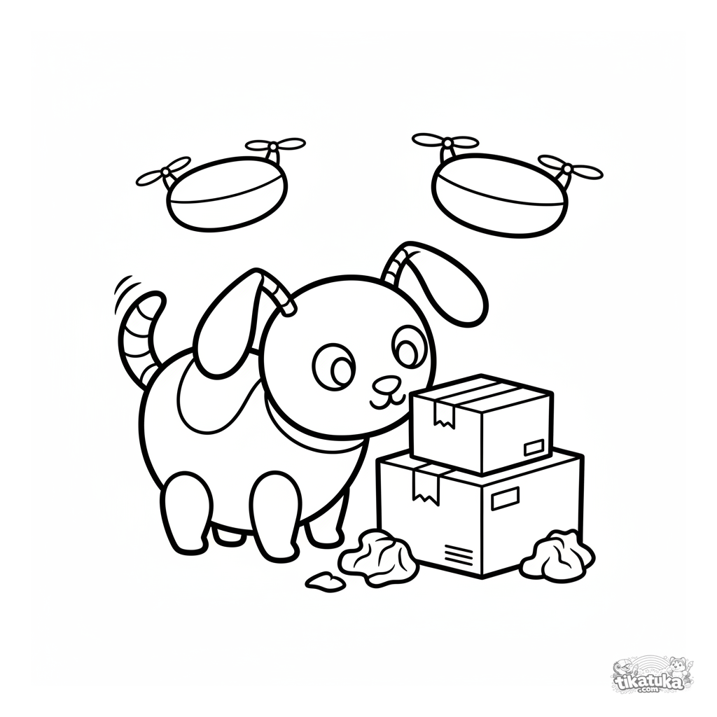 Página para colorir para crianças pequenas: um cachorro robô amigável explora um armazém entre caixas e drones voadores. Formas simples e margens amplas.