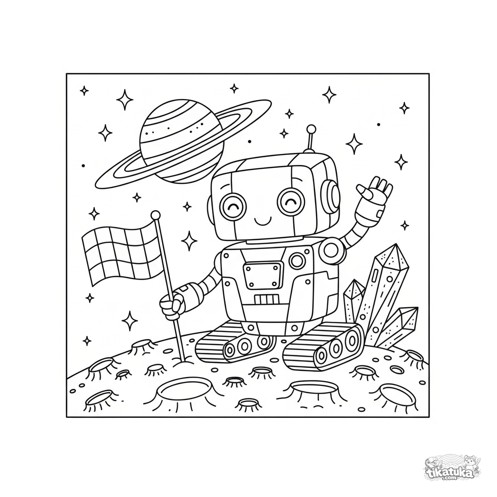 Página para colorir de uma cena espacial: um robô amigável planta uma bandeira em uma lua alienígena cheia de crateras. Para crianças de 6 a 9 anos.