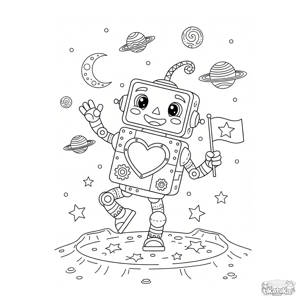 Página para colorir para crianças maiores de 7-12 anos: um robô amigável com painel de coração se equilibra em uma cratera lunar. Cena detalhada com planetas e rochas.
