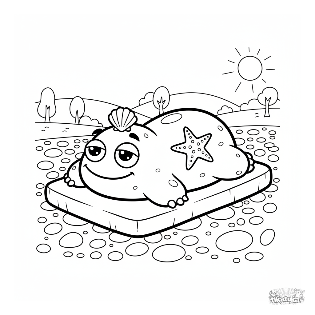 Página para colorir de um monstro de pedra amigável tomando sol em uma praia de seixos. Para crianças de 5 a 8 anos.