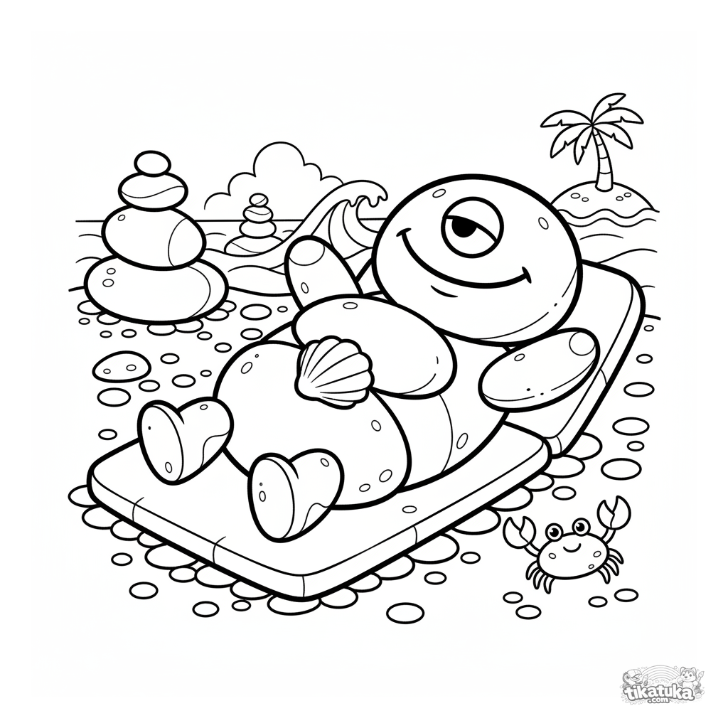 Página para colorir de um monstro de pedra amigável tomando sol em uma praia de seixos. Para crianças de 3 a 6 anos. Cena fofa e tranquila.