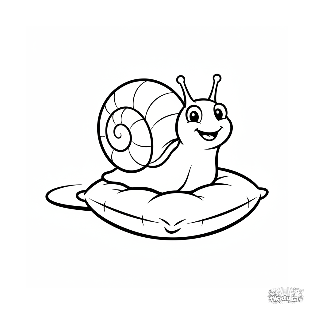 Página simples para colorir para 2-3 anos: um caracol sorridente com casa-casco rastejando em um travesseiro macio. Muito poucas linhas internas.