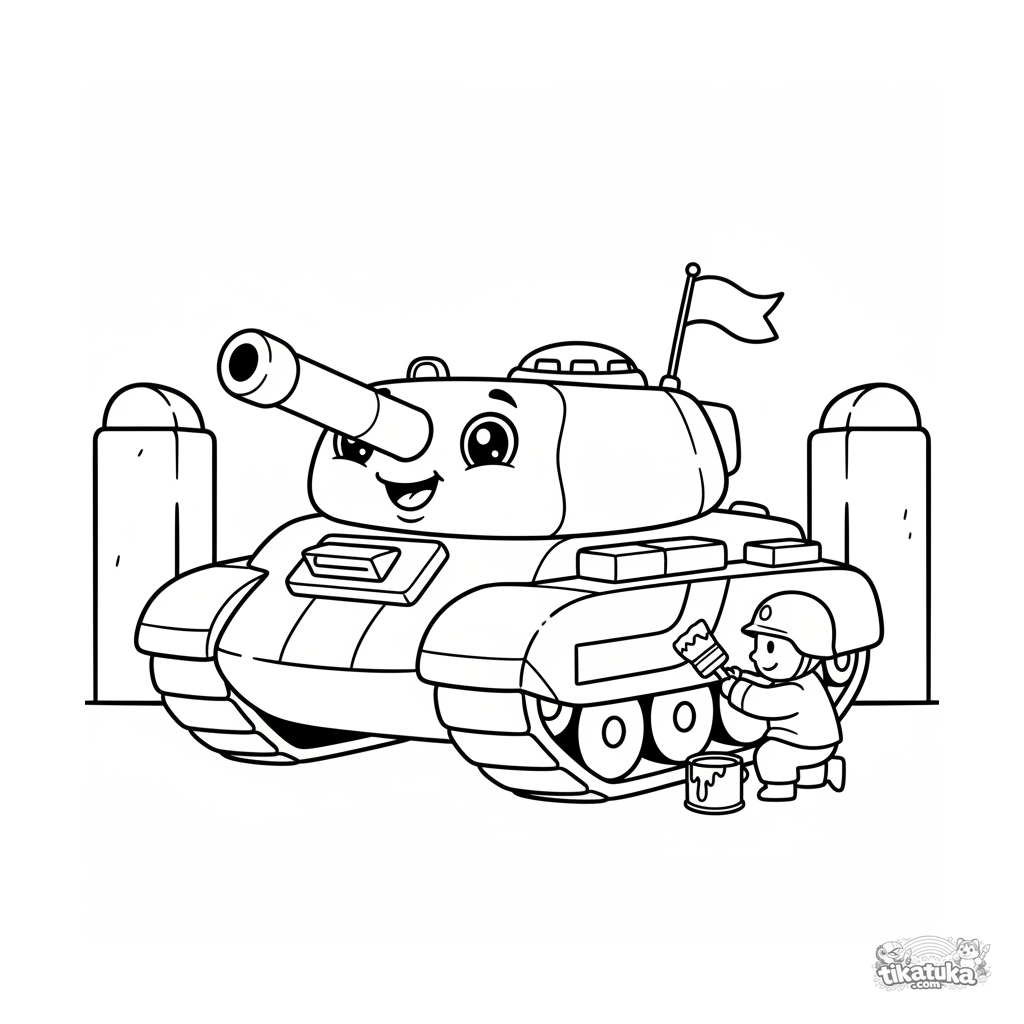 Página para colorir muito simples para bebês de 2-3 anos: um tanque amigável guarda a entrada de um acampamento de campo. Formas grandes, detalhes mínimos, margens amplas.