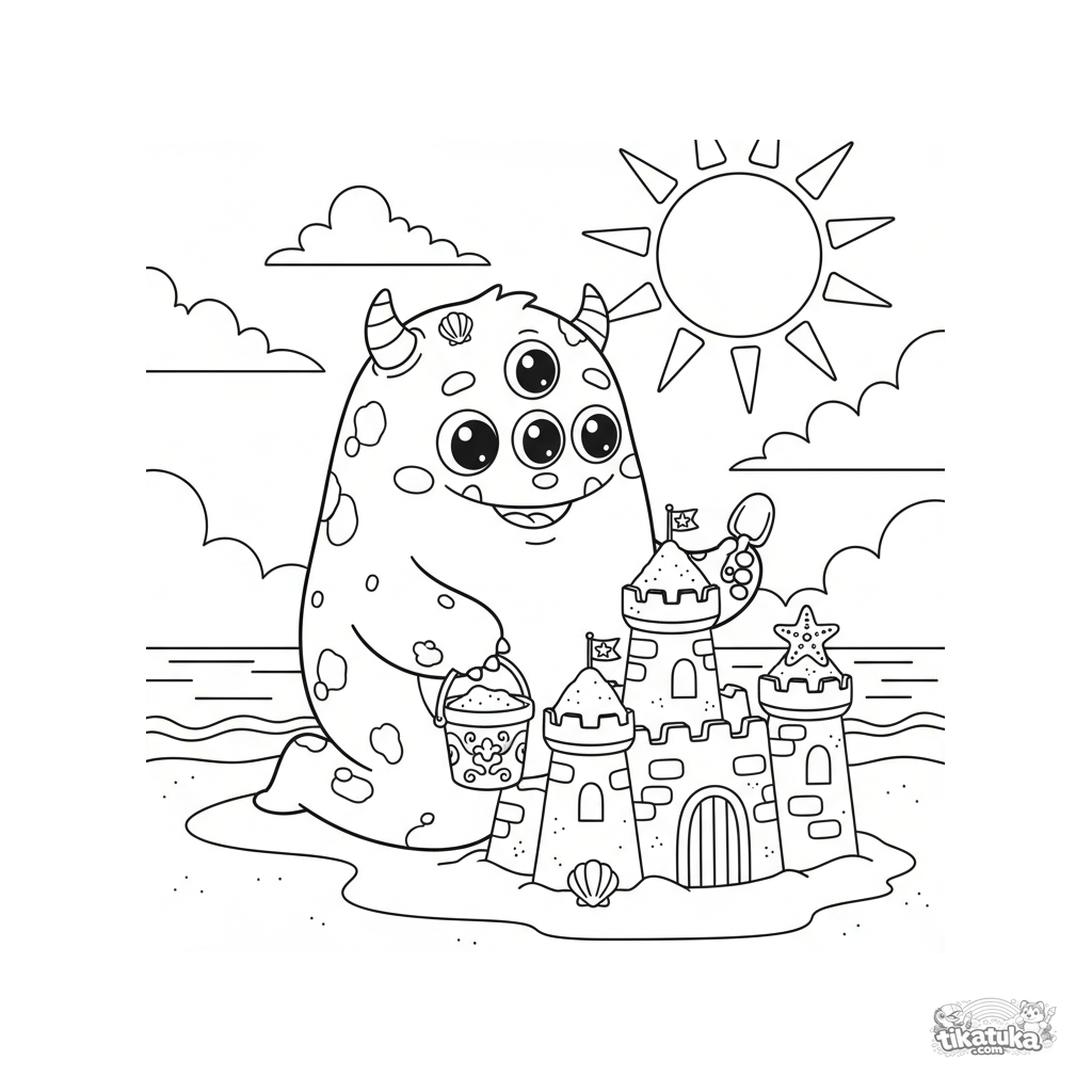 Página divertida para colorir para crianças de 4-6 anos: um monstro amigável de três olhos constrói um castelo de areia na praia. Cena brilhante e positiva com detalhes claros.